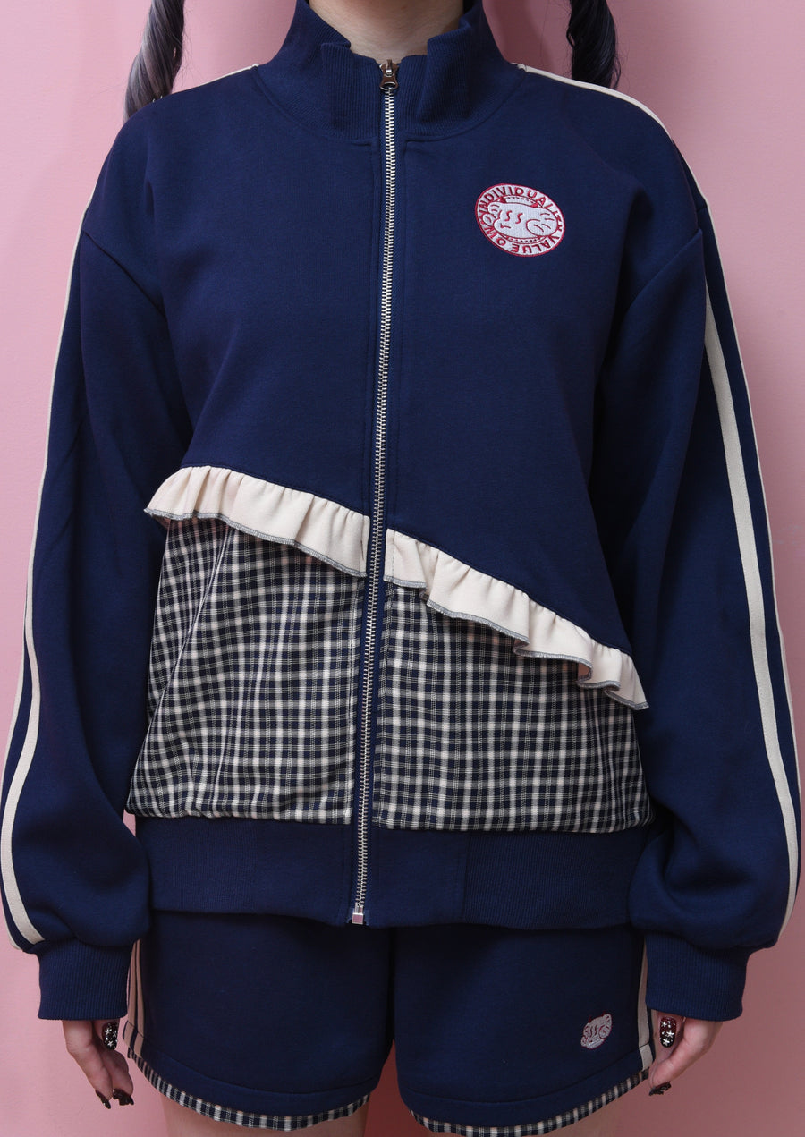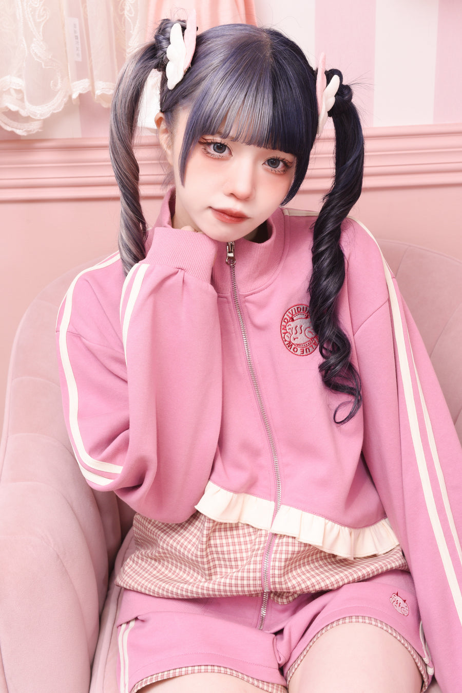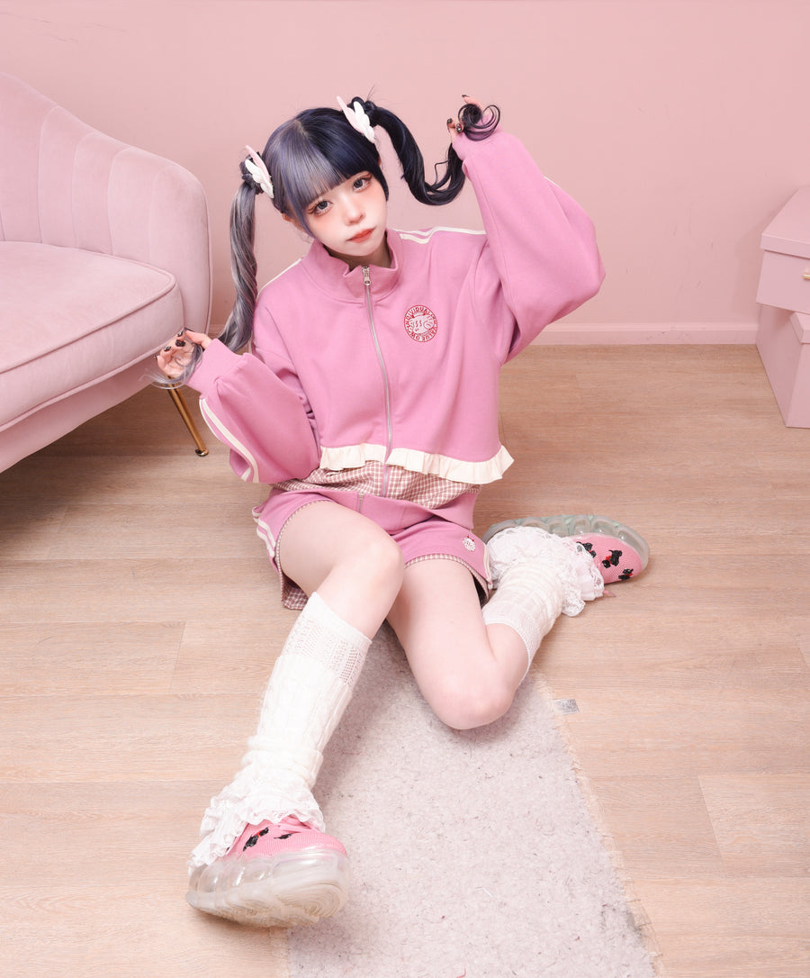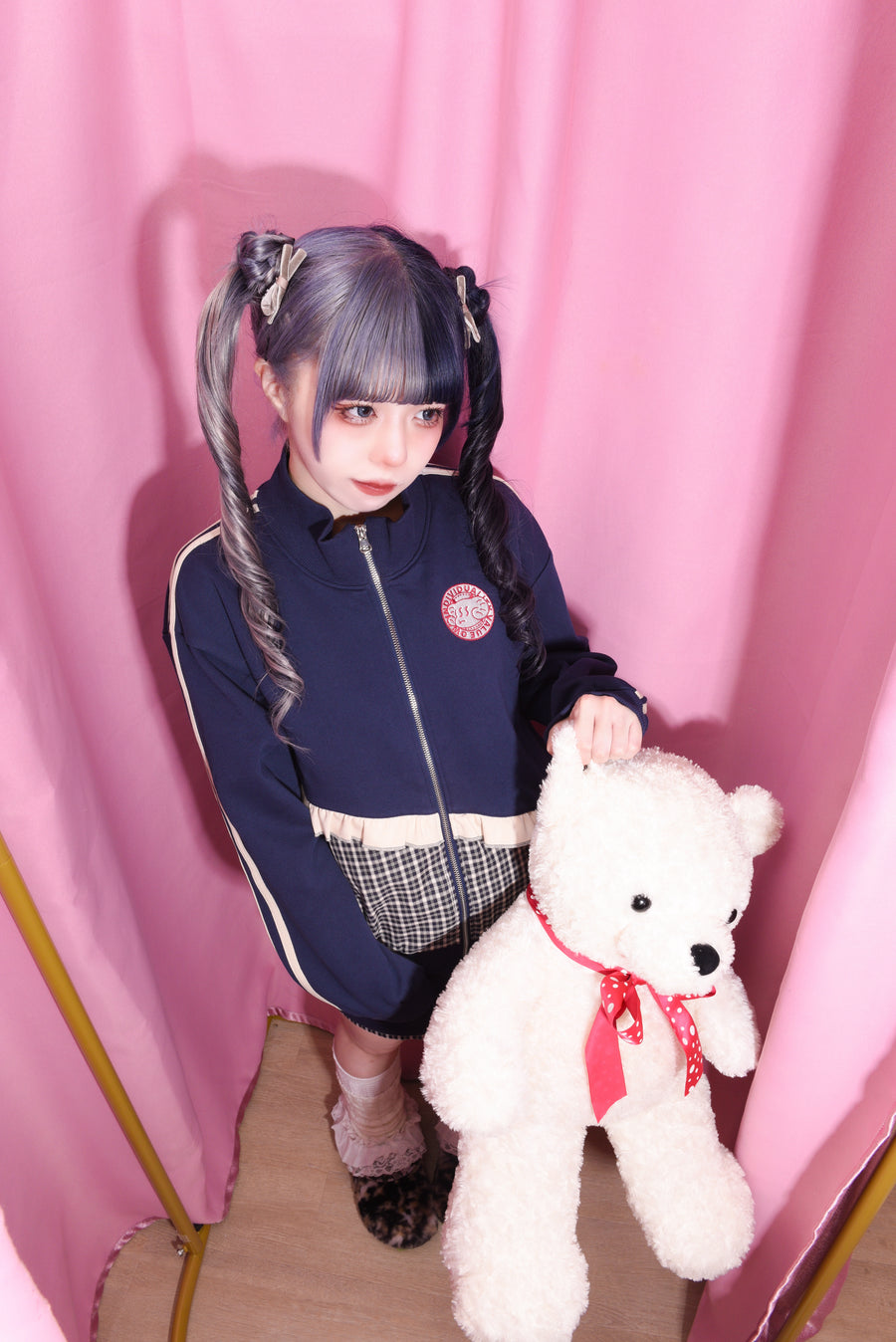 オフホワイトのフリルとラインが、ジャージ生地にマッチしている”可愛すぎない”、可愛さです。