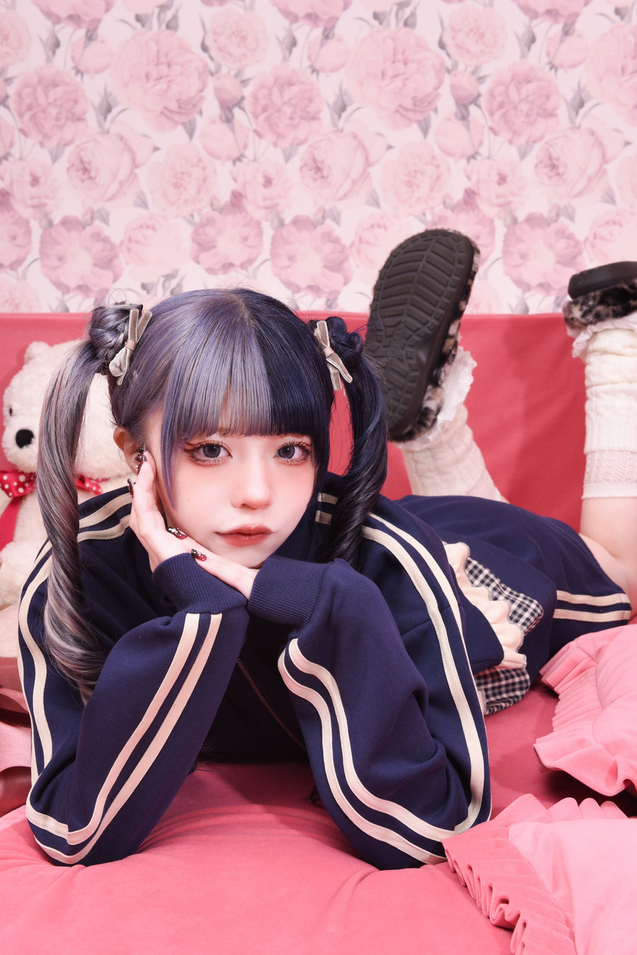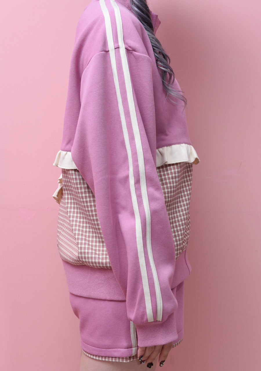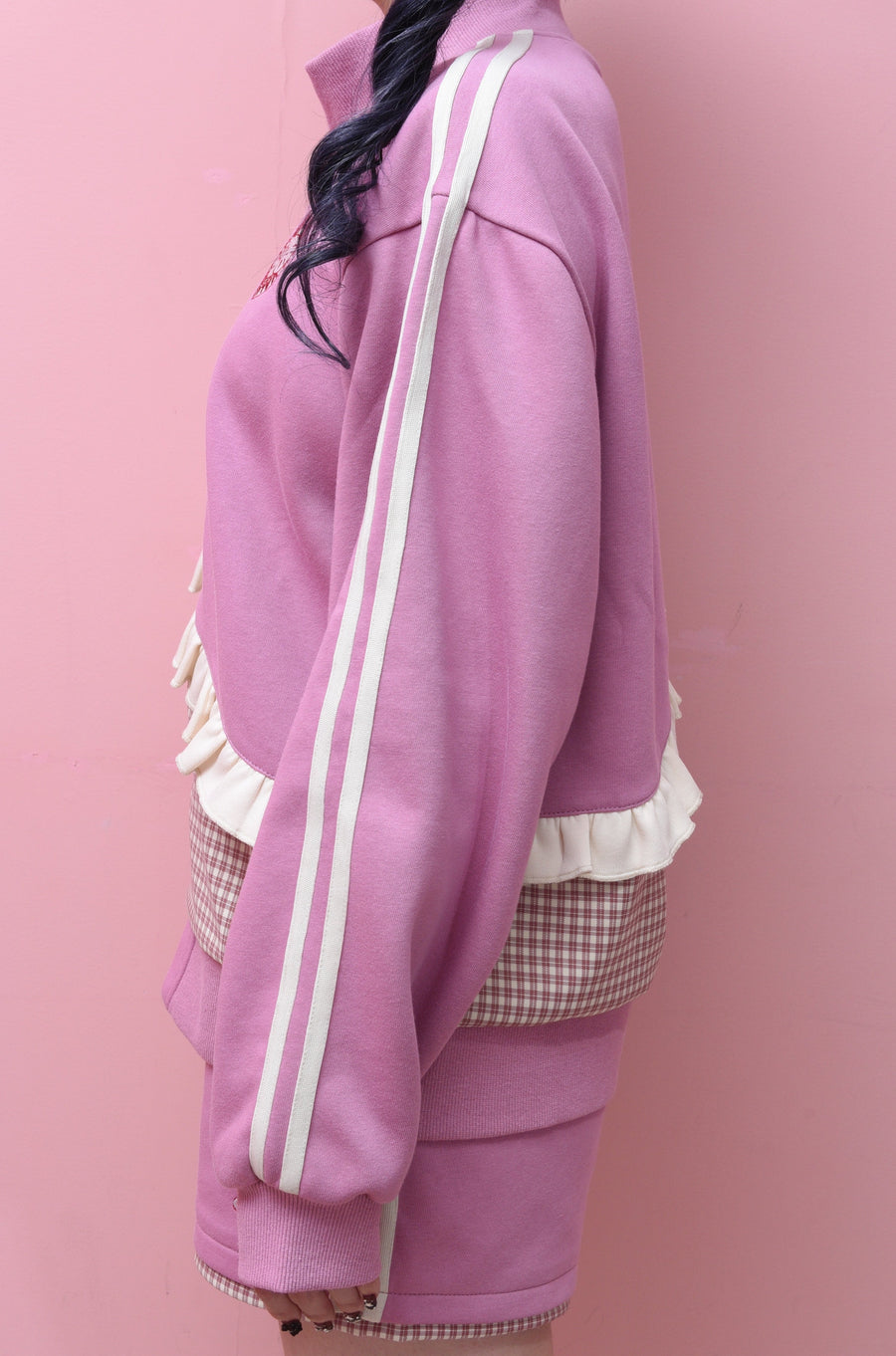 オフホワイトのフリルとラインが、ジャージ生地にマッチしている”可愛すぎない”、可愛さです。