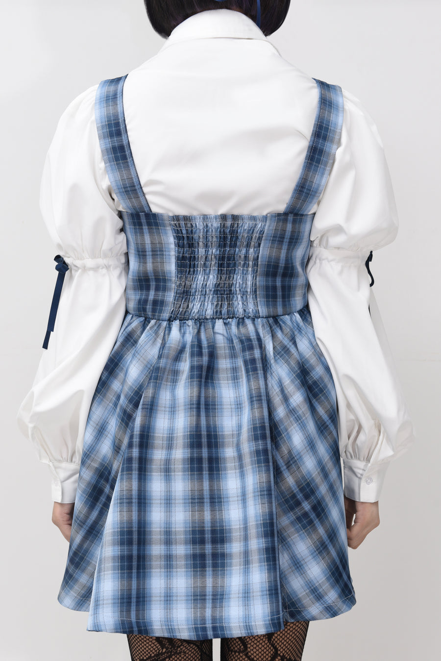 チェック生地で制服っぽい感じを出しつつ深いUネック、そして全面から見えるレースアップでガーリーとキュートな雰囲気を出せるワンピースです。