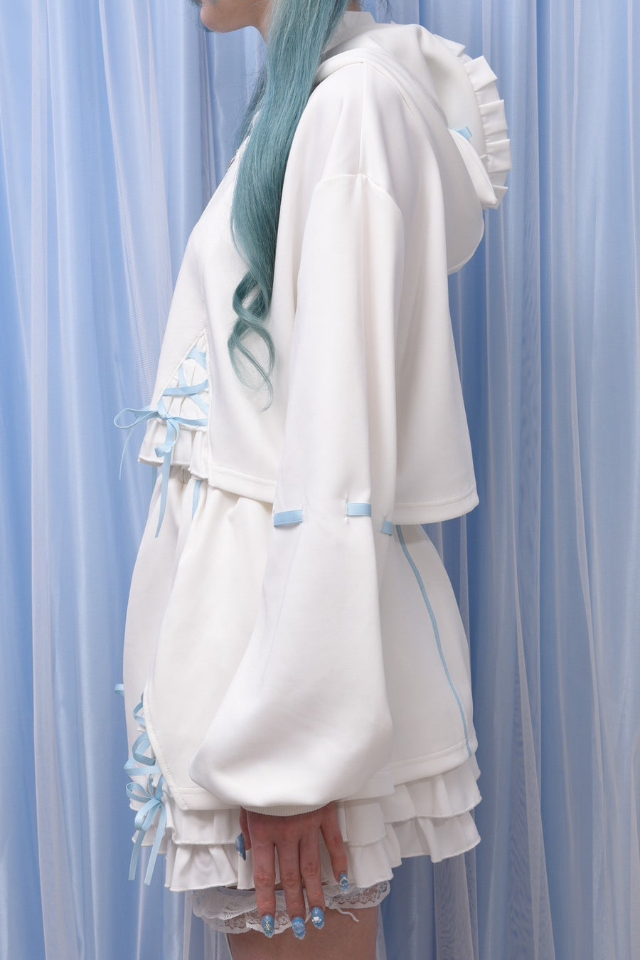 三角型のレースアップが全面左右についている可愛いフリルスカートです。猫耳フードパーカーとセットアップで、ジャージ生地で作られています。