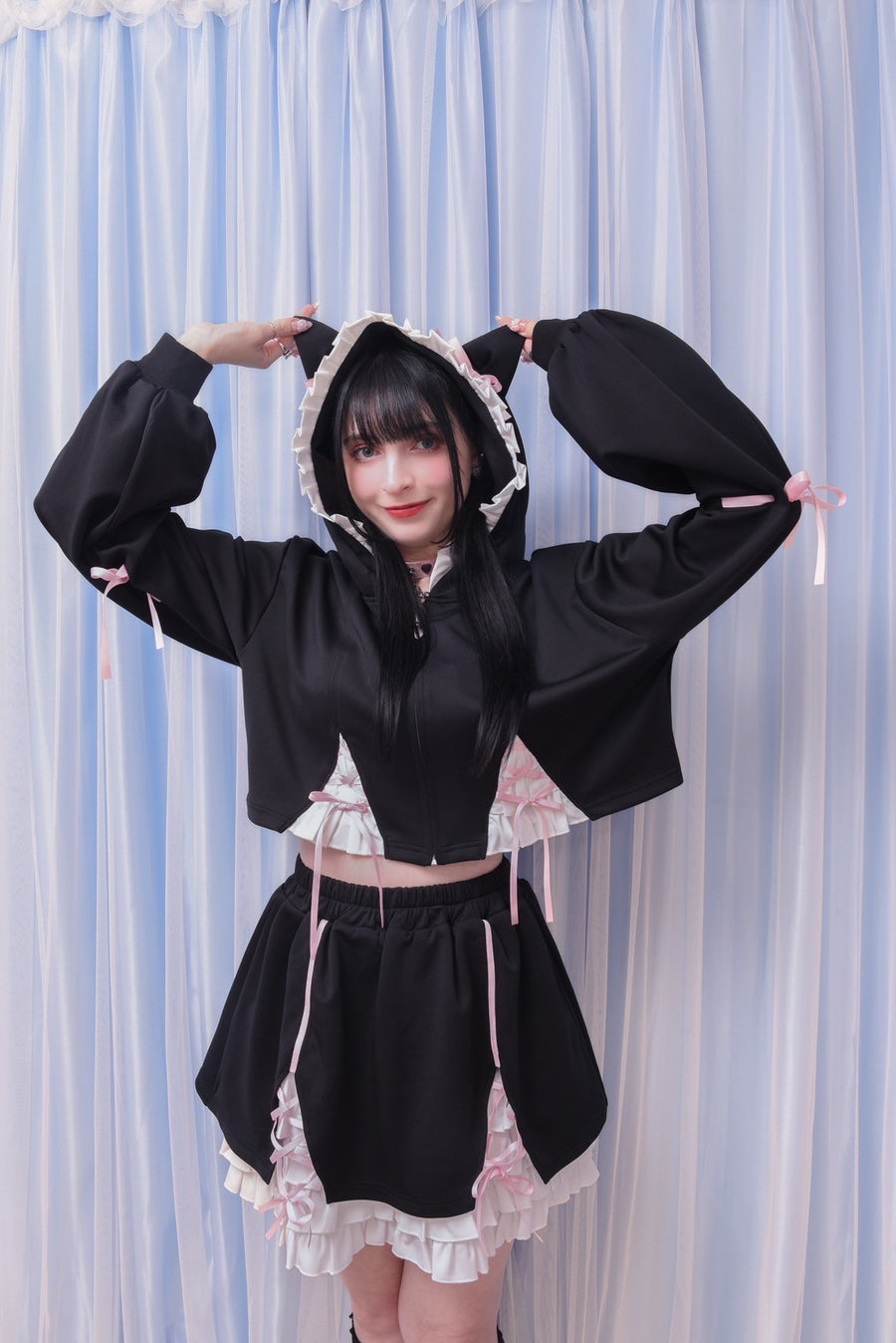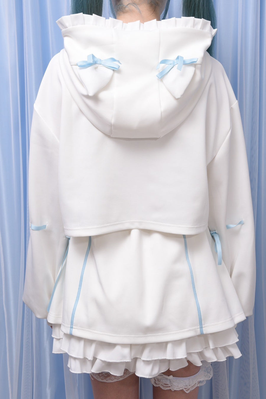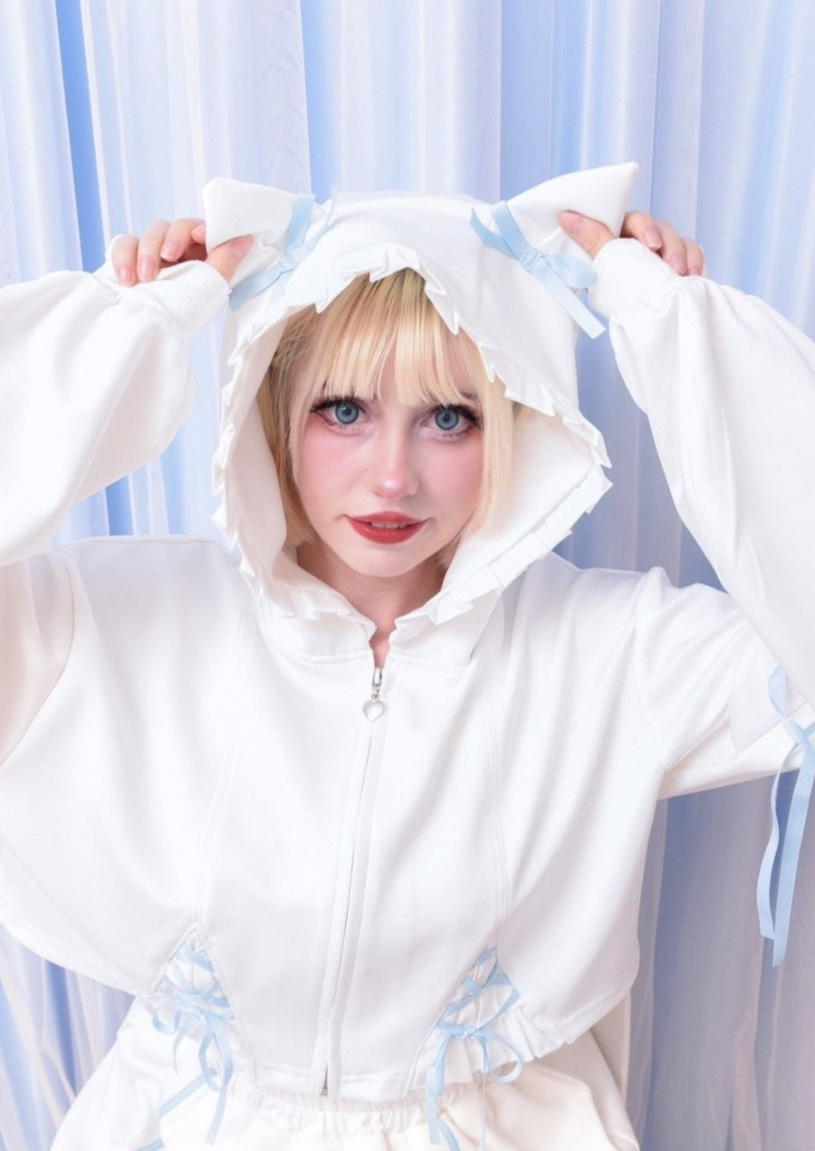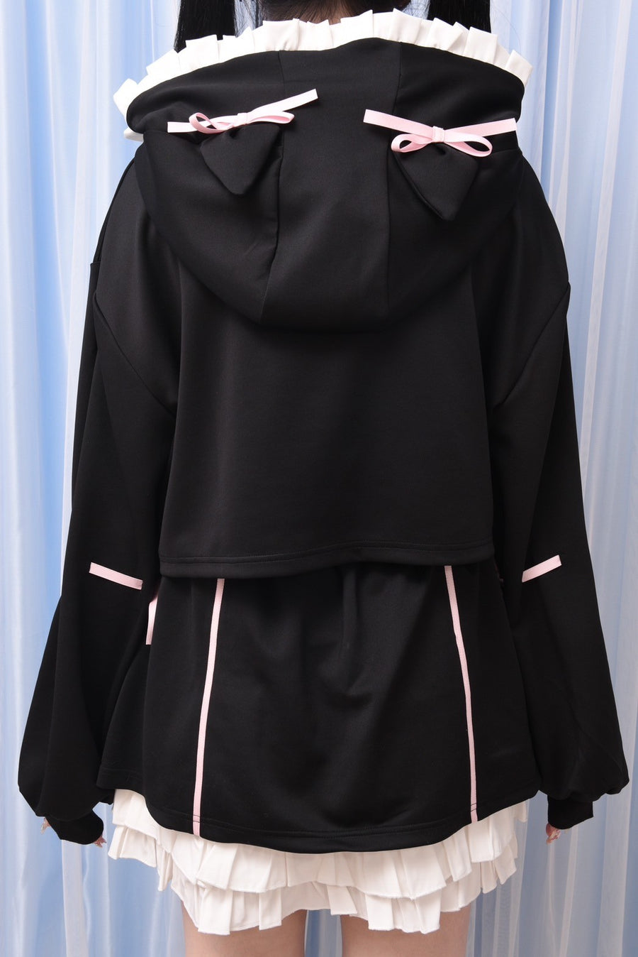 フリルの付いたフードに猫耳を付けたフードパーカーです。猫耳には綿が入って立体感があり、リボンで更にデザインポイントを与えています。