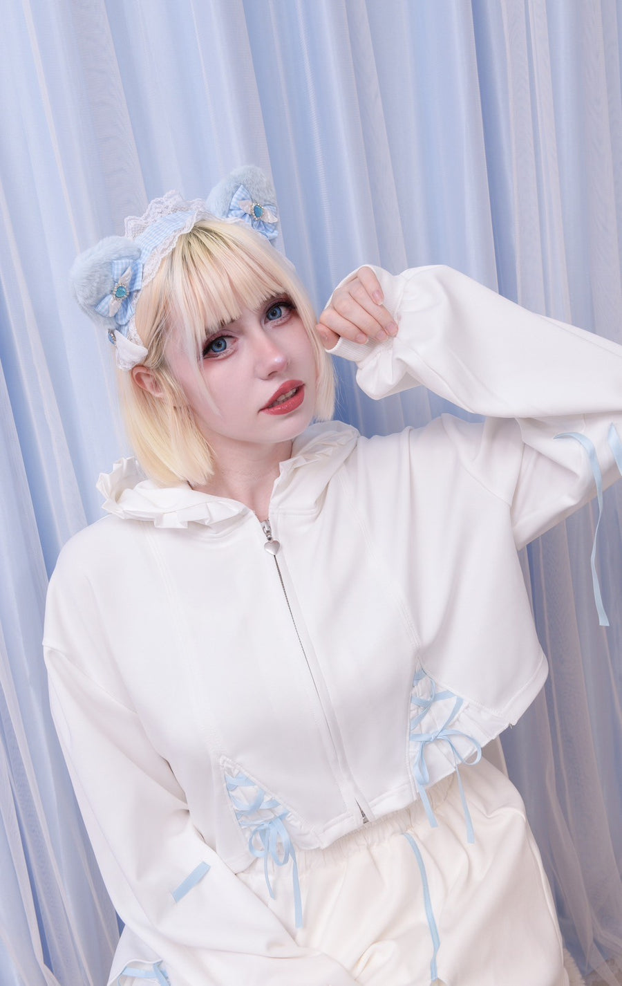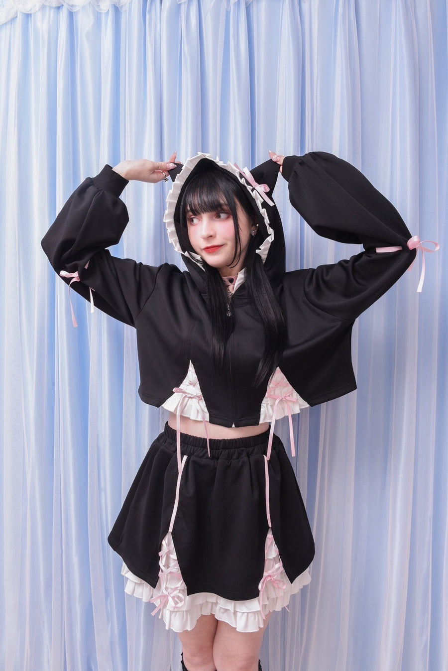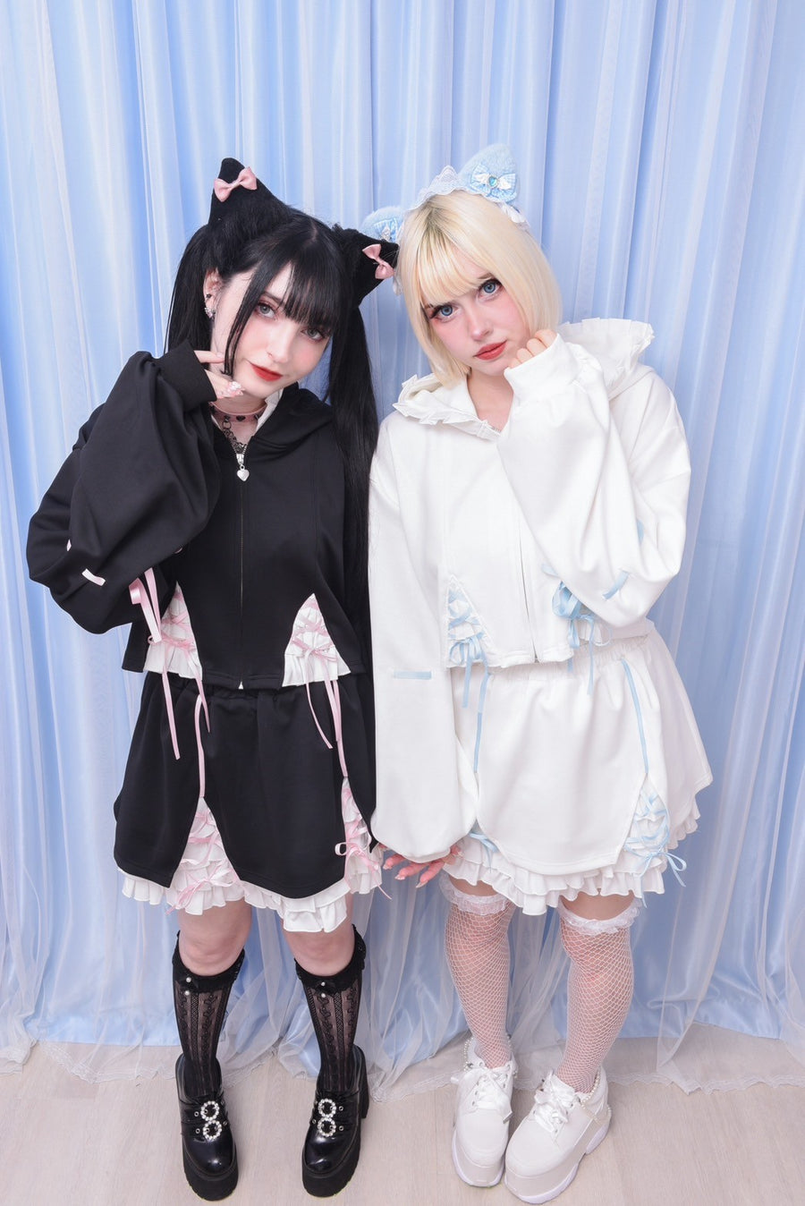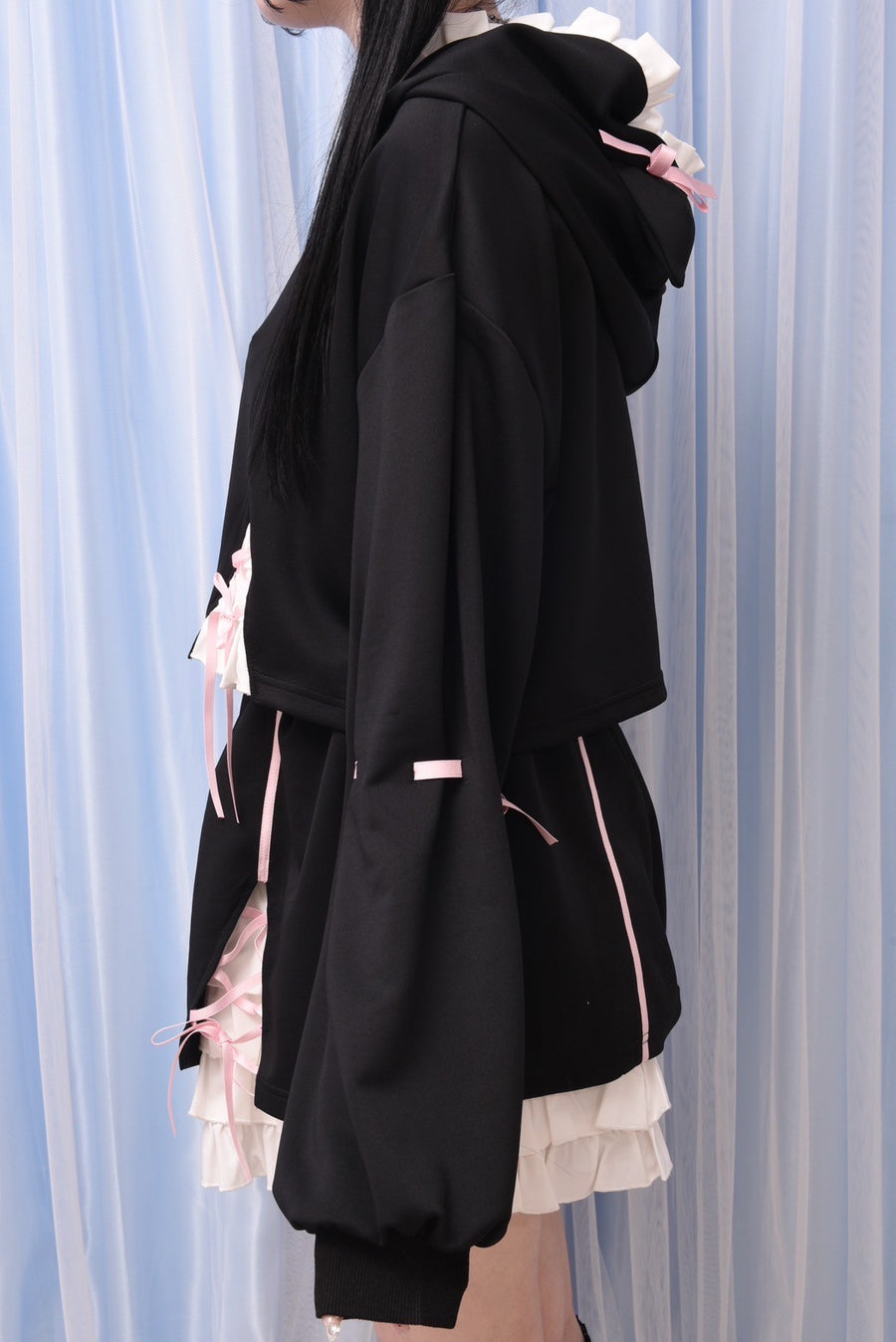 フリルの付いたフードに猫耳を付けたフードパーカーです。猫耳には綿が入って立体感があり、リボンで更にデザインポイントを与えています。