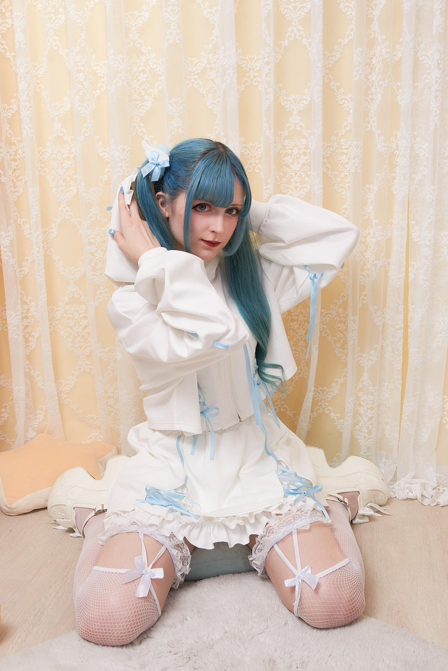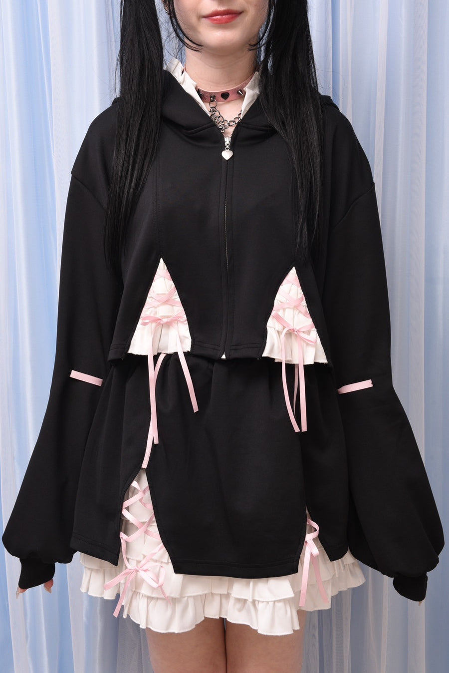 レースアップフリルスカートと同じく三角型のレースアップが付いており、袖にリボンを通しておりますのでリボンいっぱいで可愛い商品です。